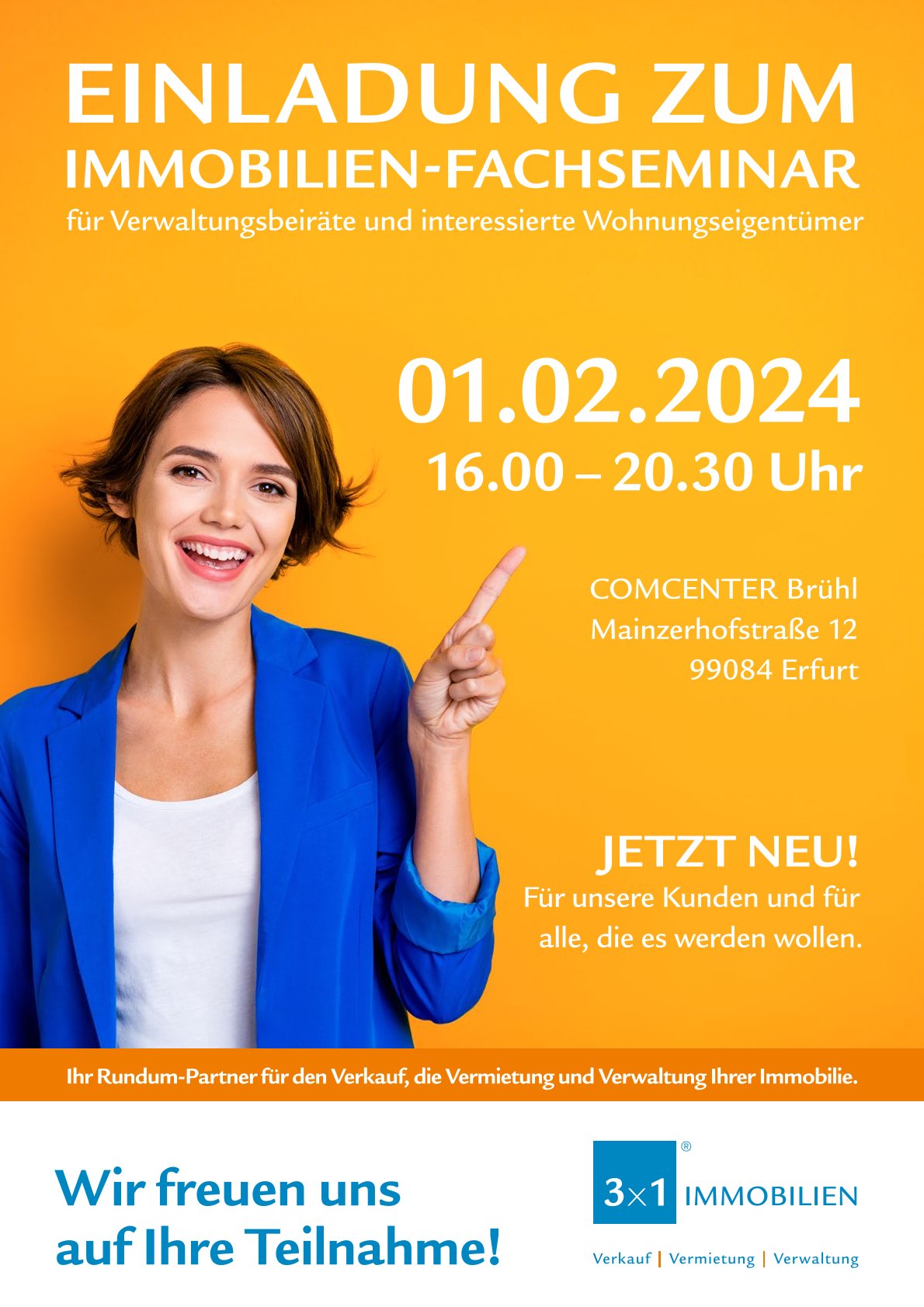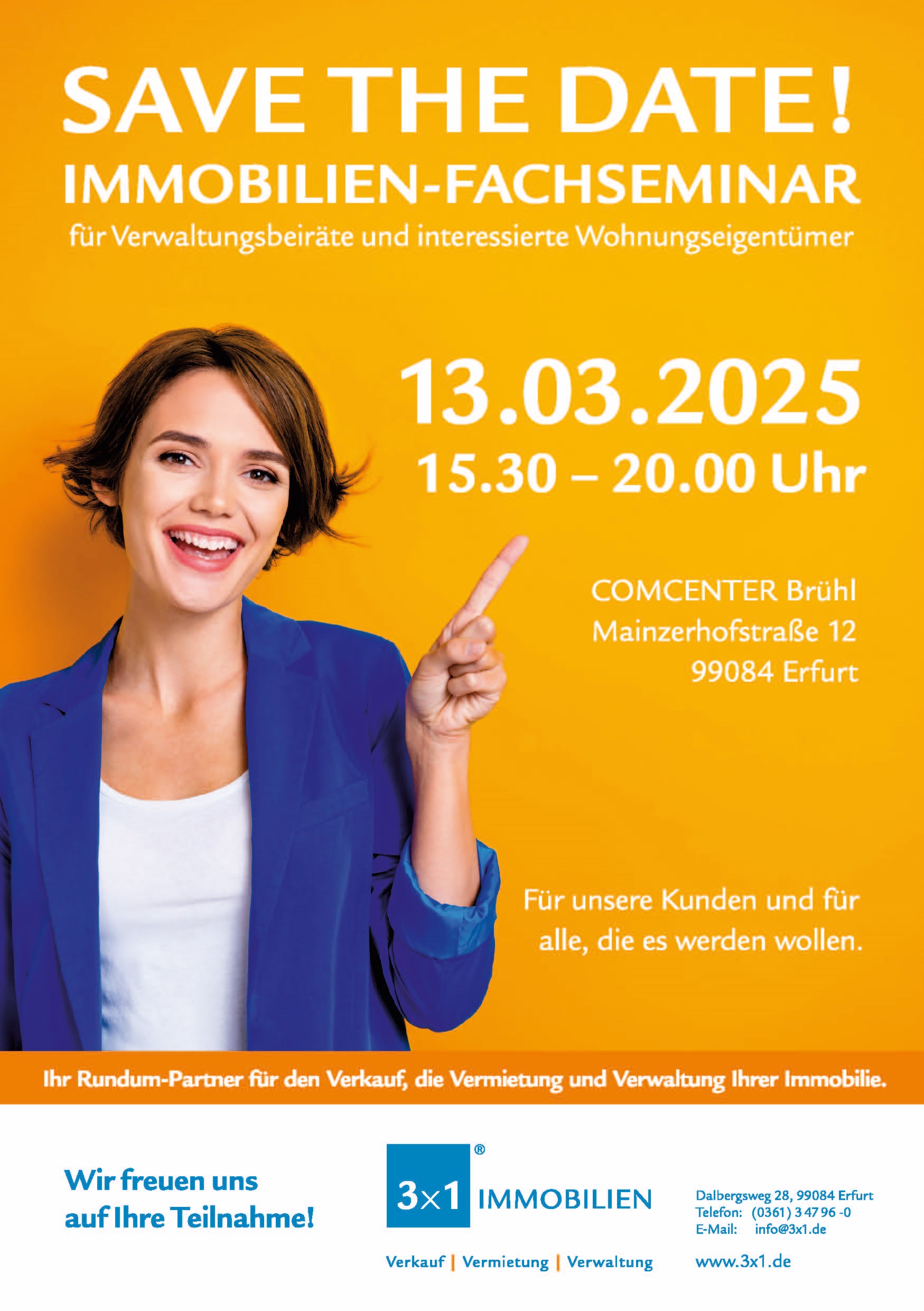 !Achtung! Schon mal vormerken am 13.03.2025 bieten wir wieder unser Immobilien-Fachseminar für Verwaltungsbeiräte und interessierte Wohnungseigentümer in Erfurt im COMCENTER an. Einfach schon mal in den Kalender 2025 eintragen!